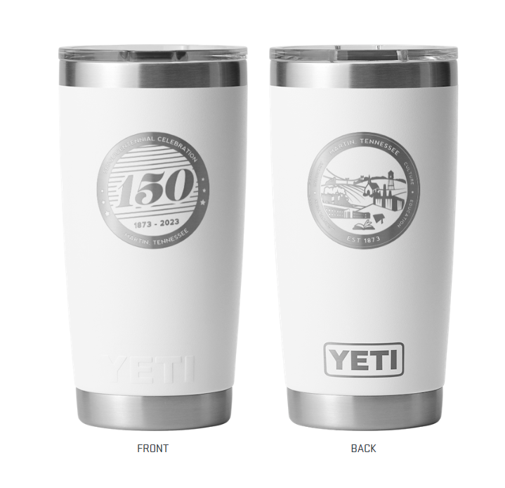 20 oz RAMBLER TUMBLER with lid. A go-to for coffee on the go. Featuring the Martin 150 Year emblem and City of Martin seal in silver.